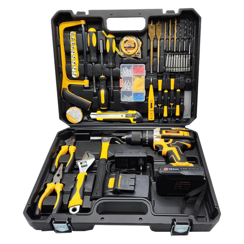 این دستگاه مجموعه ای کامل به همراه انواع ابزار الات جهت تمامی امور خانگی، اداری و ... می باشد که دریلی چکشی با سه نظام 13 میلیمتری تمام فلزی دارد که برای کارهای متعدد و سخت قابل استفاده است. گیربکس این دریل تقویت شده و بسیار قدرتمند است و از عهده امور مختلف بر میآید. این دستگاه دارای دو عدد باتری لیتیوم یون 98 ولت می باشد. دریل با گشتاور فوق العاده 35 الی 60 نیوتن متر می باشد. دارای دریل با سرعت 0 الی 600 و 0 الی 1500 دور بر دقیقه می باشد.باتری ها تولید جدید و دستگاه دارای دیمر و تنظیم سرعت می باشد. دارای چراغ جهت کار در محیط های تاریک می باشد قابلیت چپگرد و راستگرد دارد دارای کلیه ابزارهای مصرفی شامل؛ آچار فرانسه سایز 8، انبردست، دمباریک، چکش، بکس تک سایز 4 تا 13 میلیمتر، متر 3 متری، پیچ گوشتی دوسو و چهارسو سایز بزرگ، مته آهن سایز 3، 4 و 5 ، مته چوب سایز 3، 4 ،5 میلیمتر، مته برگی سایز 16 و 20 ، دارای 9 عدد نوک پیچ گوشتی، تبدیل نوک پیچ گوشتی به بکس، چسب برق، کاتر، فازمتر دیجیتال، 5 عدد تیغ کاتر، دو سایز پیچ گوشتی موبایلی دو سو و دو سایز پیچ گوشتی موبایلی چهارسو، کمان اره چوب و فلز، مجموعه سایزبندی پیچ و رولپلاک می باشدکیفیت عالی می باشد همراه کیف BMC حرفه ای عرضه میگردد